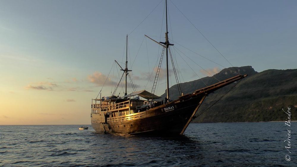První polovinu dnešního dne strávíme ve vodě s největší rybou planety, žralokem velrybím. Rybáři v Triton Bay používají k lovu malých ryb plovoucí dřevěné konstrukce zvané bagany, které se pak používají k lovu větších ryb. Žraloci velrybí vědí, že na tomto místě vždy najdete něco k snědku. Vzhledem k tomu, že se tito neškodní obři zcela soustředili na vstřebávání potravy, nevěnují lidem ve vodě absolutně žádnou pozornost. Proto je téměř zaručeno, že se vám budeme moci zcela přiblížit. Posádka Damai a hosté si navíc nedávno všimli, že místní delfíni se také touží připojit k hostině.